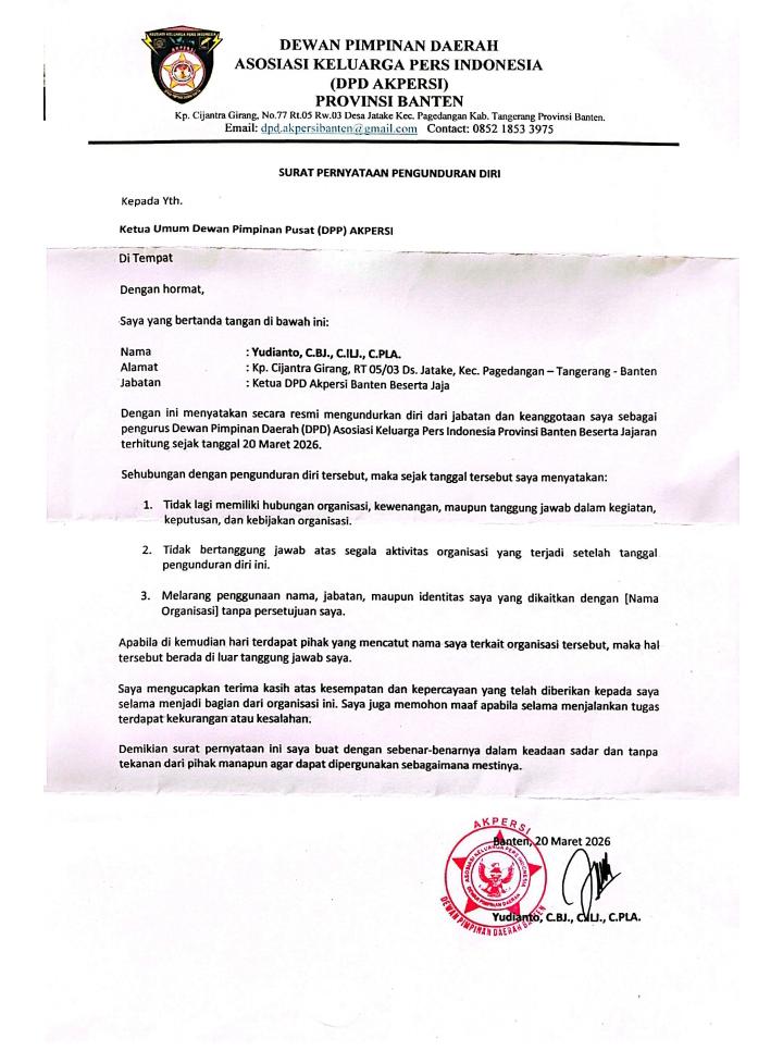 Eks Ketua DPD AKPERSI Banten, Yudianto, C.BJ., C.ILJ., C.PLA, menegaskan bahwa narasi pembekuan yang disampaikan DPP tidak sesuai dengan fakta yang terjadi di internal organisasi.